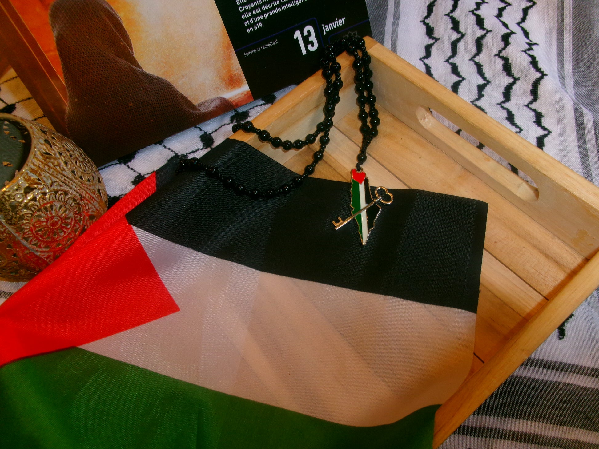Couleurs : Noir, blanc, vert et rouge (drapeau palestinien)